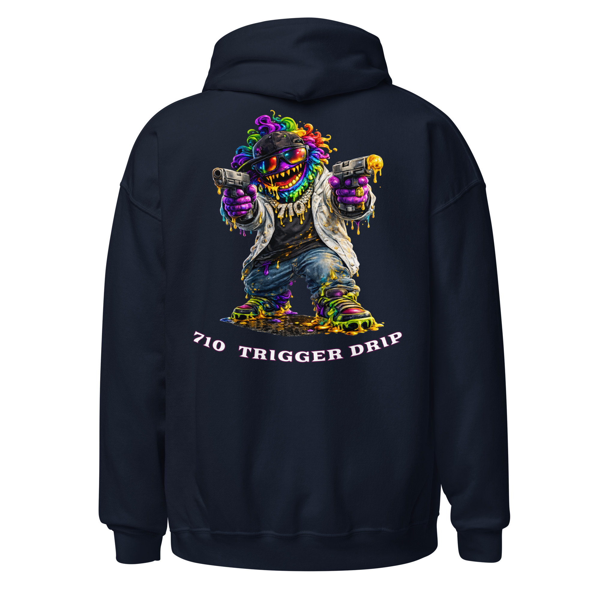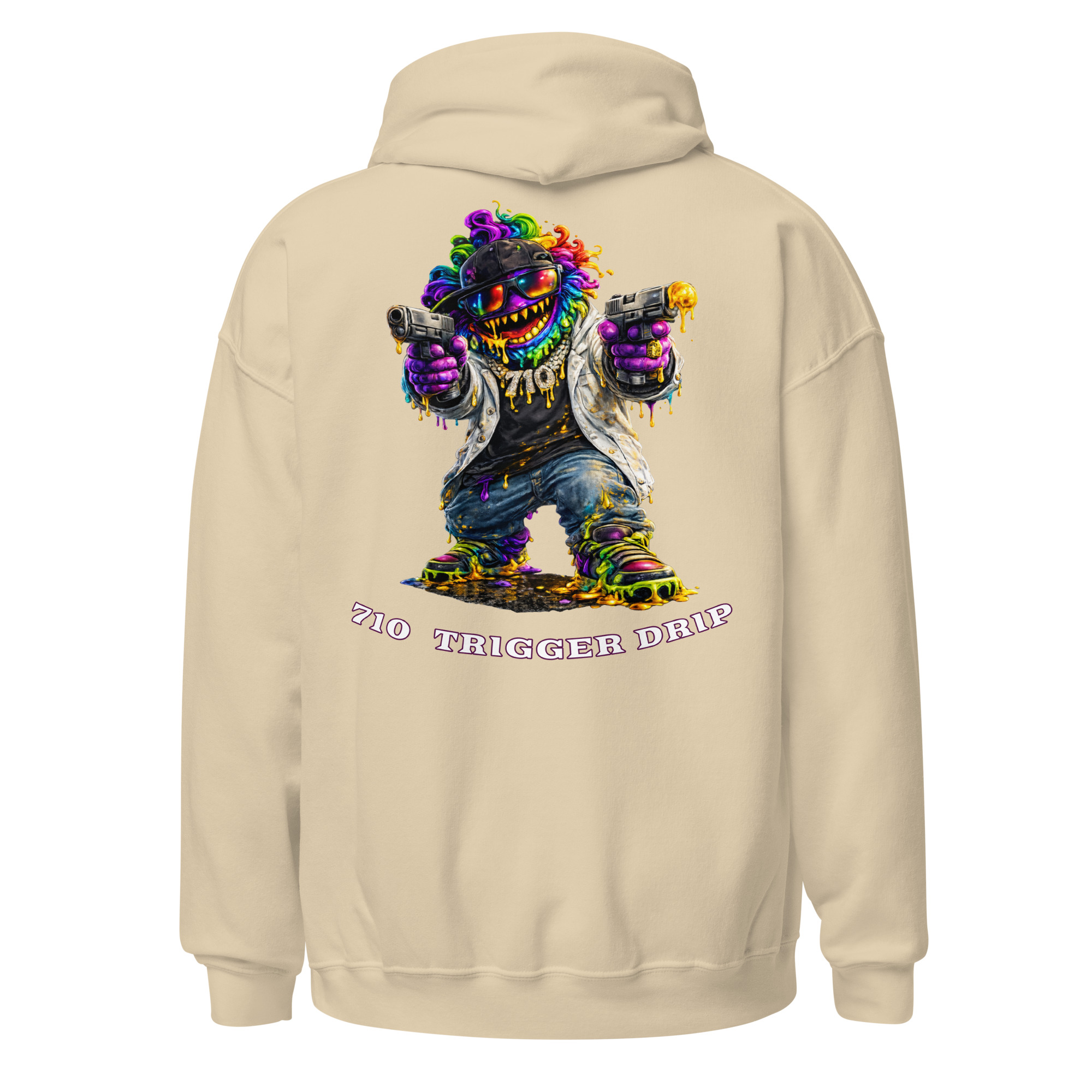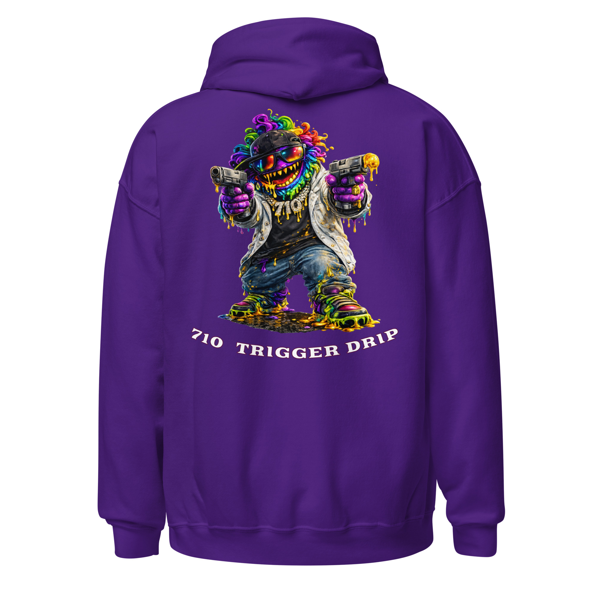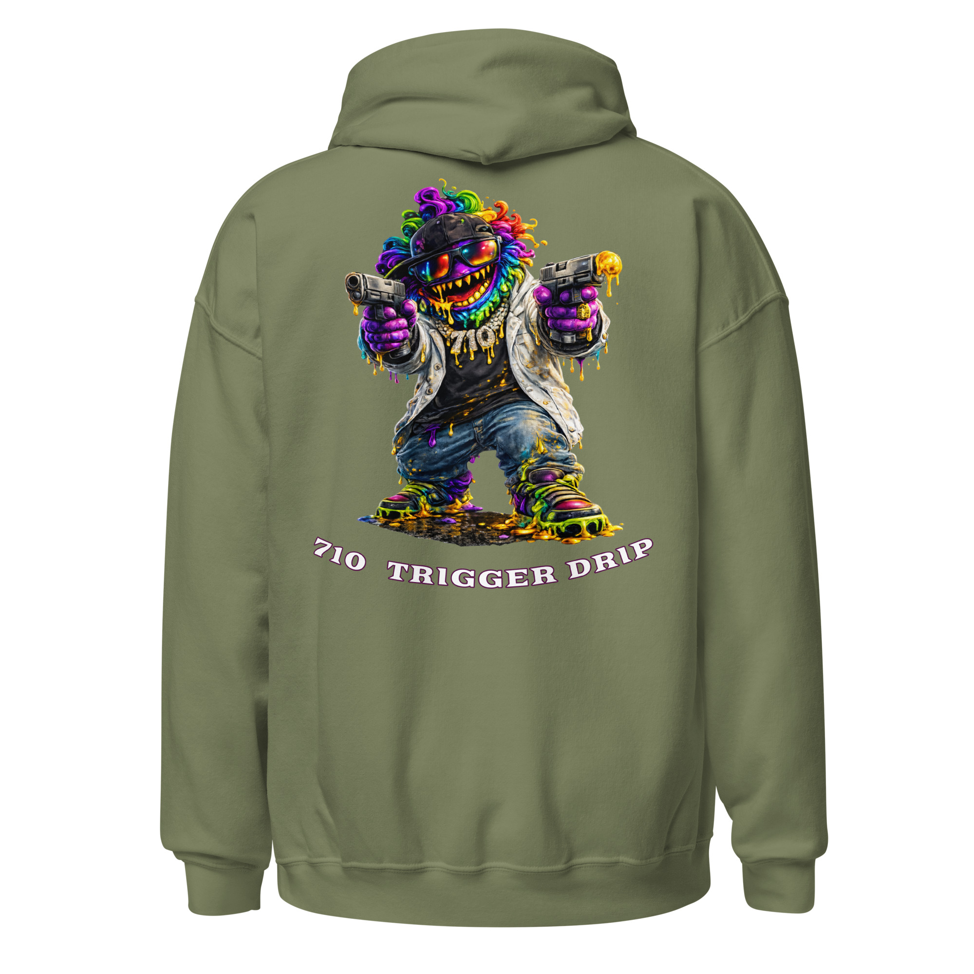 The 710 Trigger Drip hoodie brings raw street energy to cannabis culture. Featuring the Drip Lord character in full color with heavy terp drip style, this design blends street art attitude with concentrate culture.