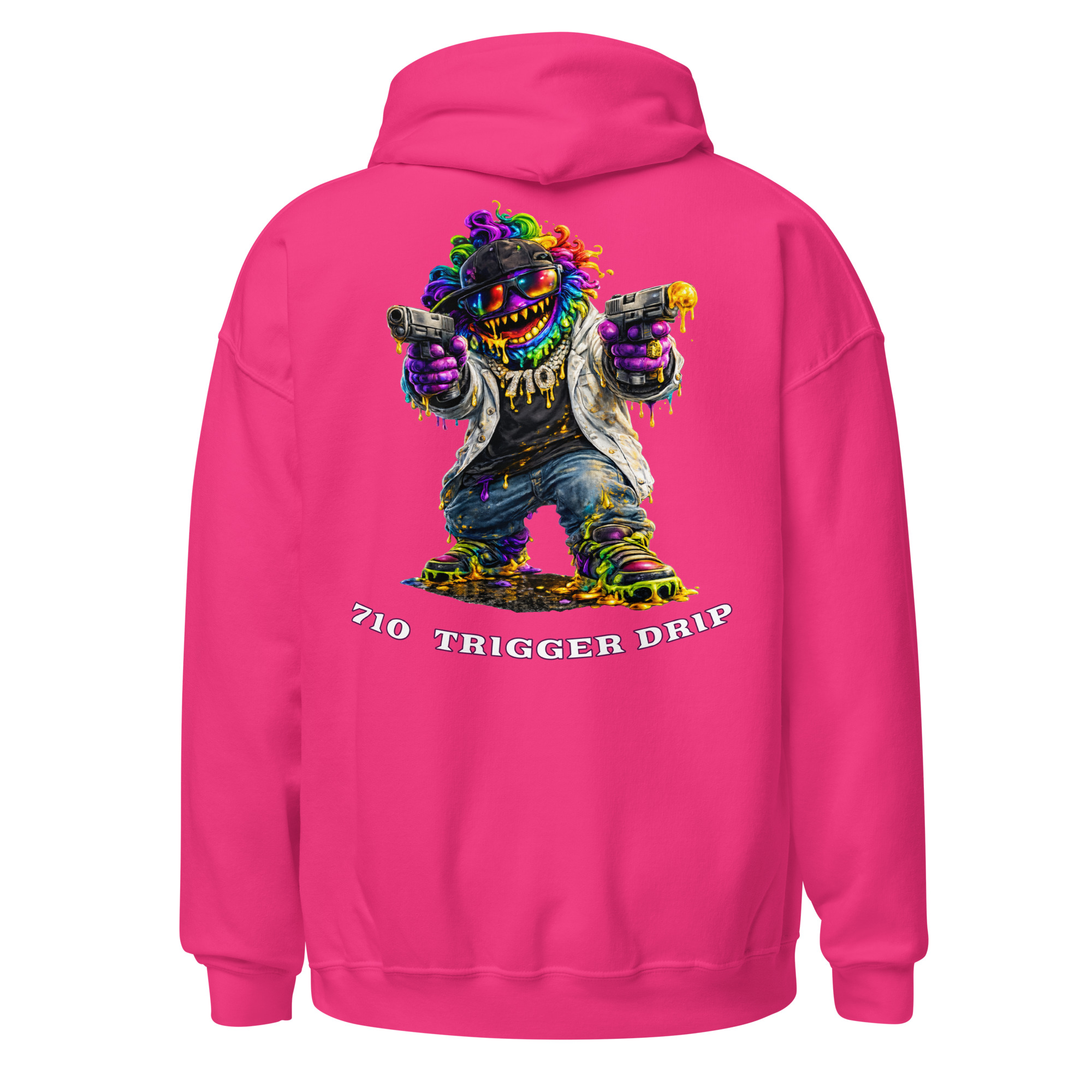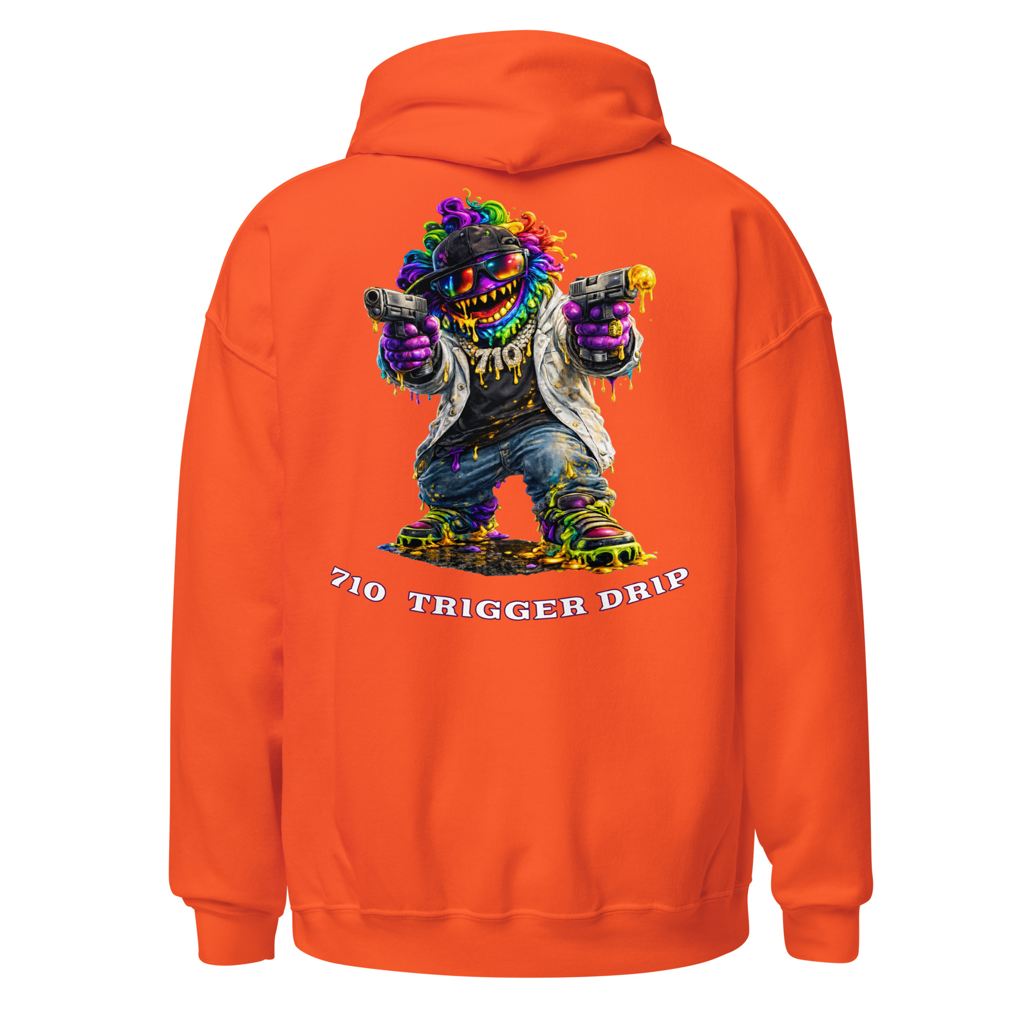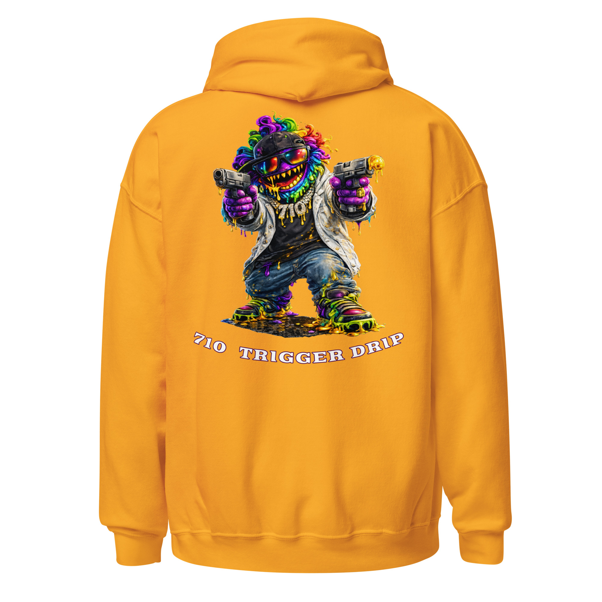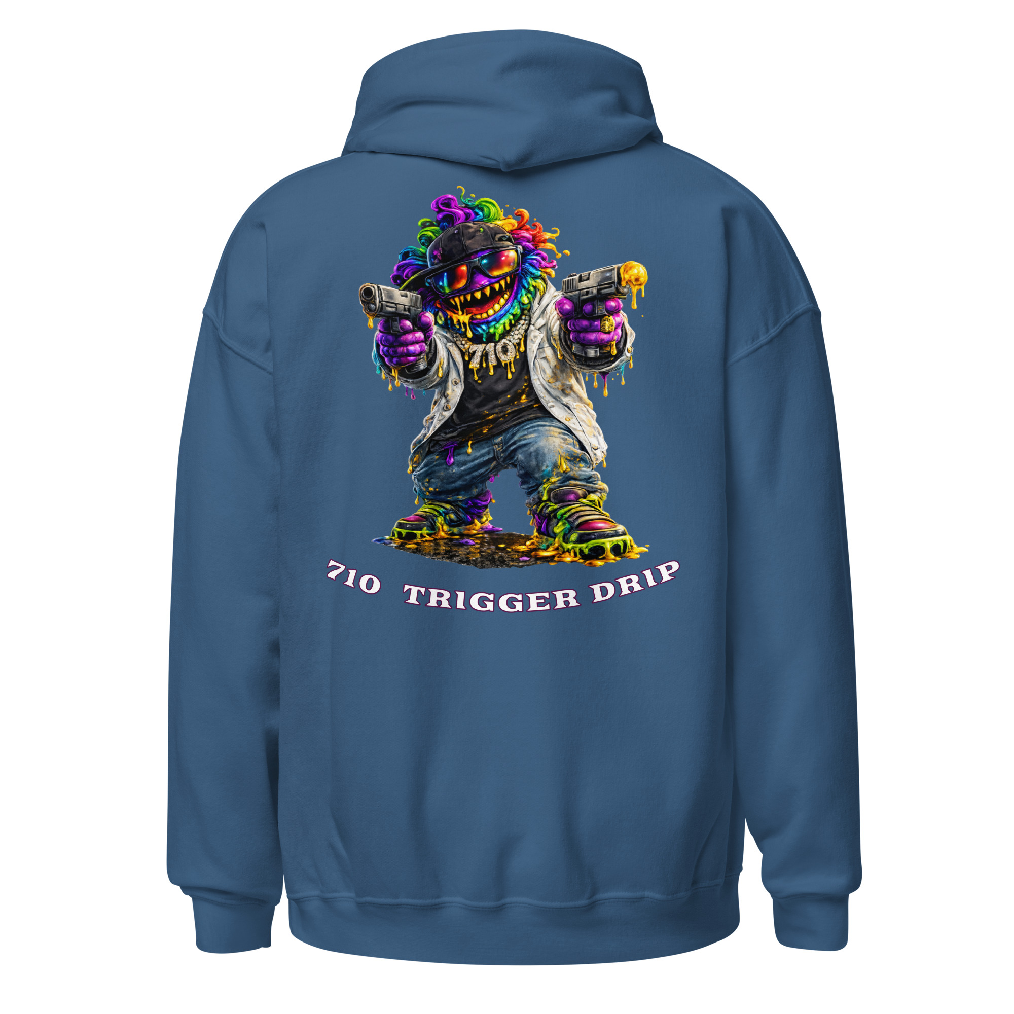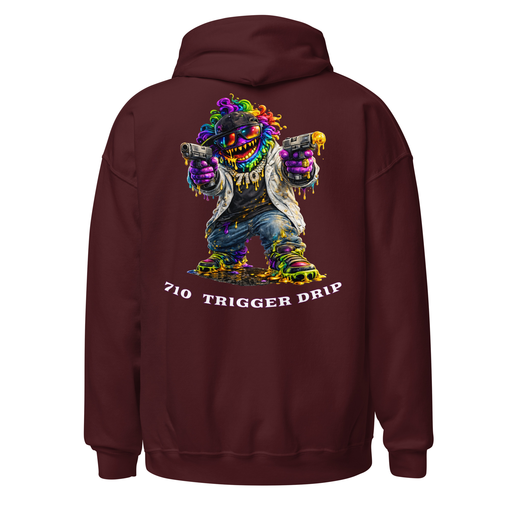 The 710 Trigger Drip hoodie brings raw street energy to cannabis culture. Featuring the Drip Lord character in full color with heavy terp drip style, this design blends street art attitude with concentrate culture.