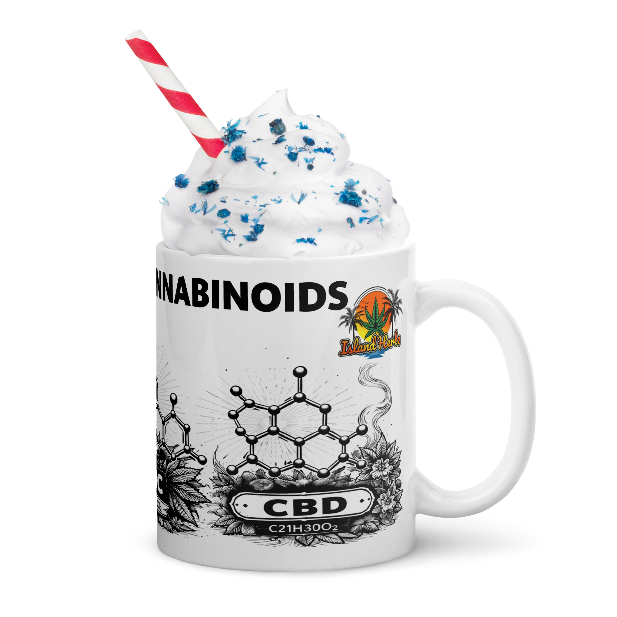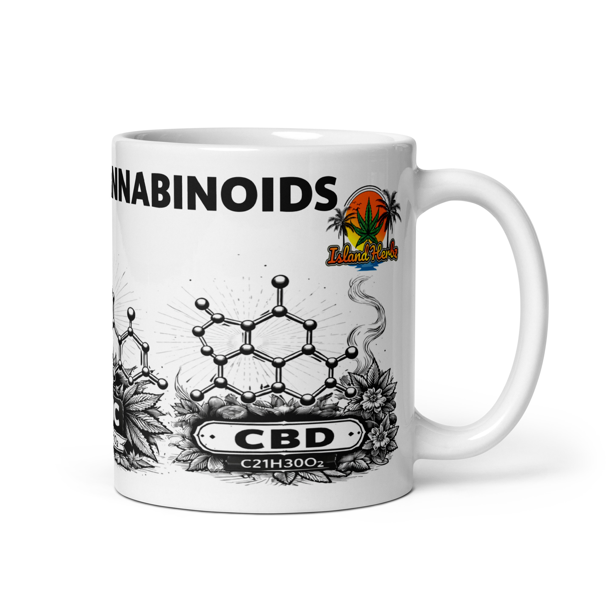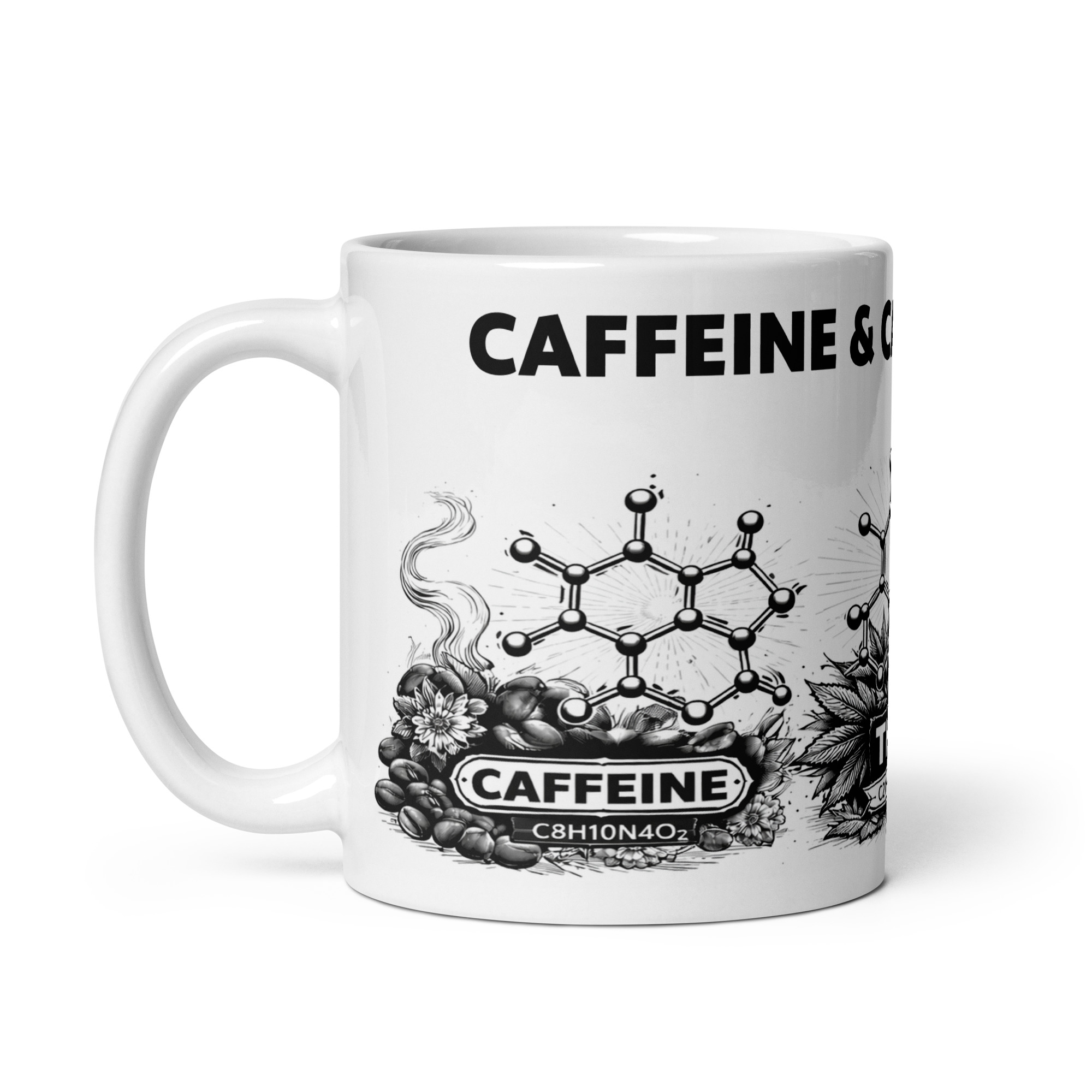 The Caffeine & Cannabinoids Mug features bold black chemical structures of Caffeine, THC, and CBD in a clean wide-format wrap. Printed on a crisp white ceramic base, this design speaks to growers, thinkers, and those who understand both fuel and flower.