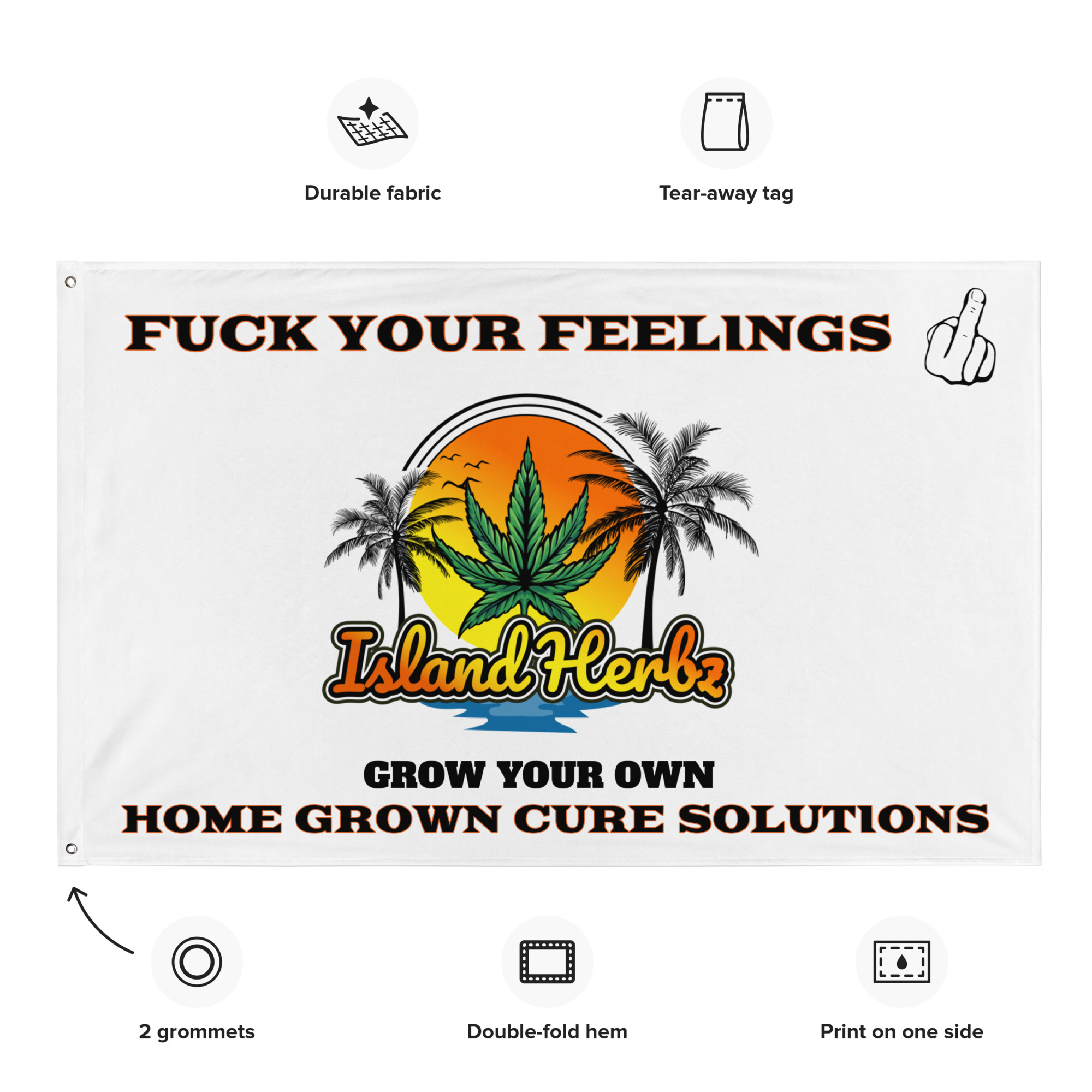 3’ x 5’ single-sided polyester banner flag featuring the bold “Home Grown Cure Solutions – Grow Your Own” design. Durable, lightweight, and finished with iron grommets for easy hanging indoors or outdoors.